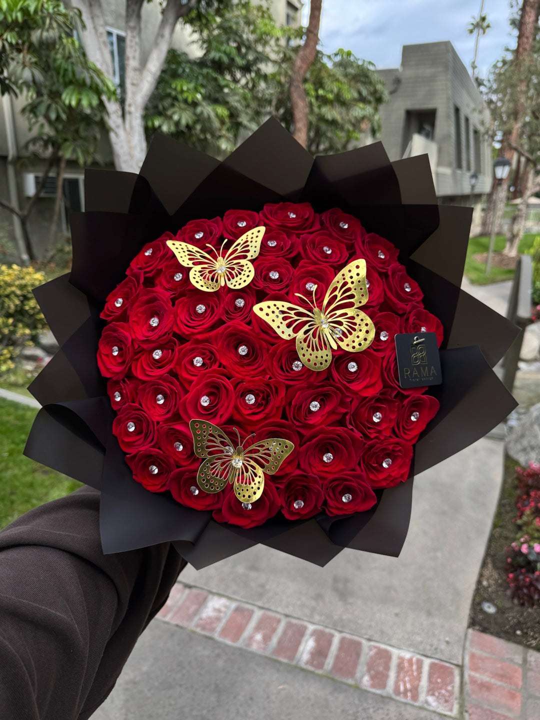 50 Red Roses Bouquet with Rhinestones & Gold Butterflies – Black Wrapping