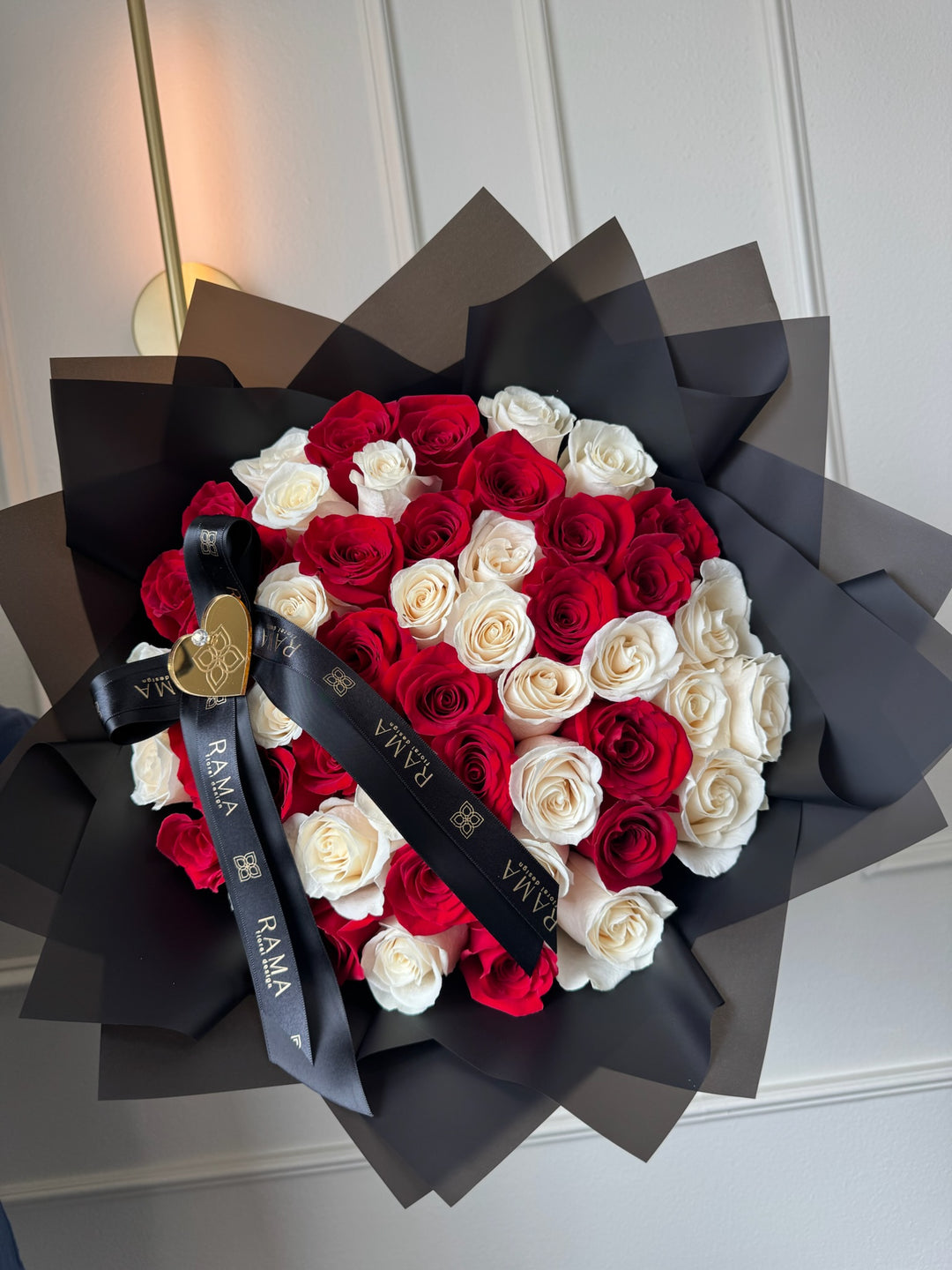 50 Red & White Roses Bouquet with Crown, Rhinestones & Custom Banner – Black Wrapping
